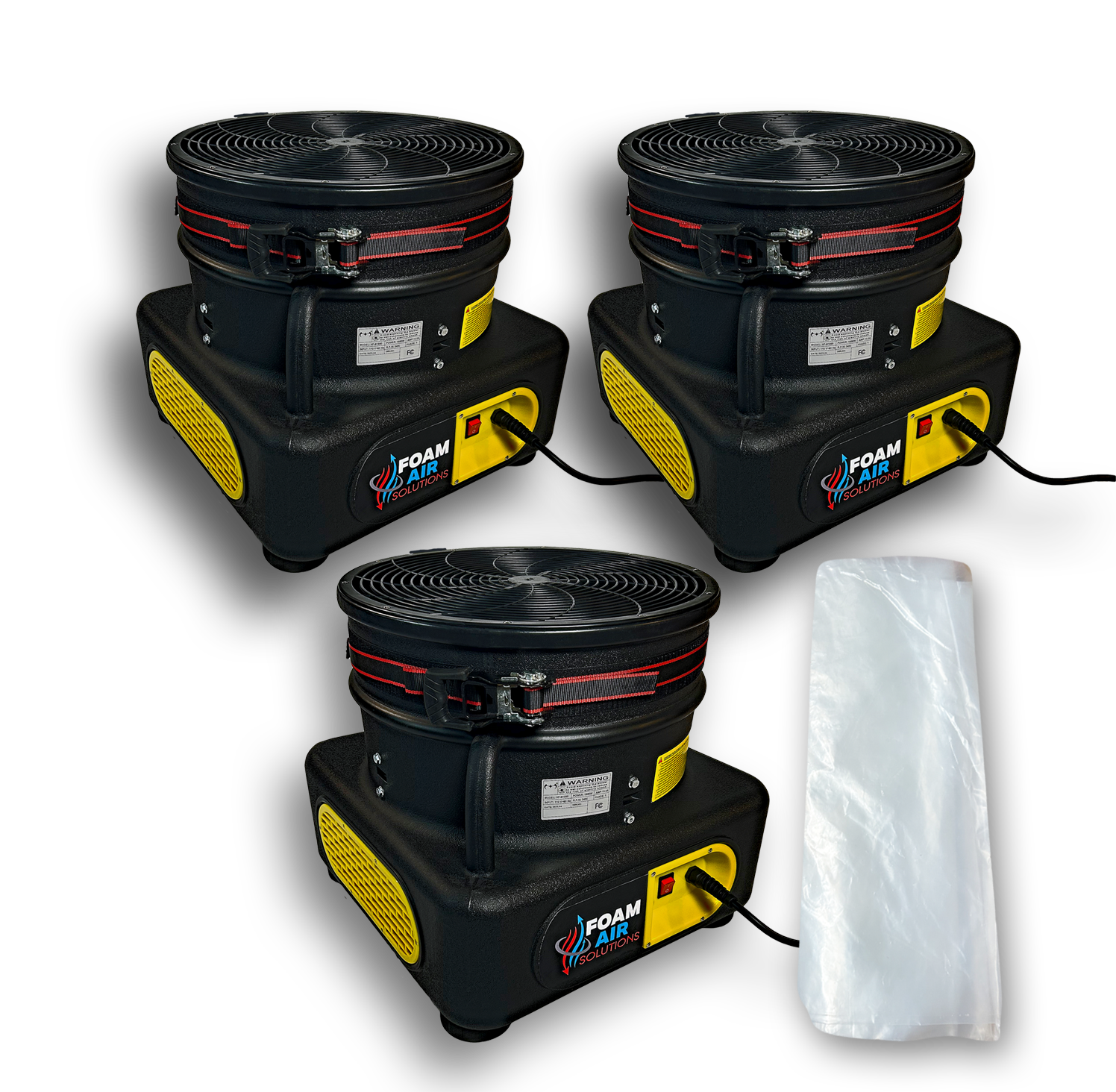 The Dual AV6400/5000 System from Foam Air Solutions is the industry’s first fully-integrated active ventilation solution designed specifically for confined-space spray foam insulation environments. Built around two high-output 6400 CFM and one 5000 CFM 1600W ventilation units, the system creates a controlled airflow loop that dramatically improves air quality and thermal safety during and after installation.